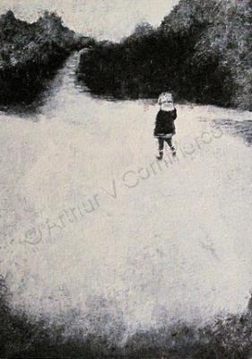 When I was a young boy, Mama Commerce would read me bedtime stories from large, dusty leather bound books she pulled off of high shelves in her extensive library. These books were filled with illustrations of children lost or wandering from home. And so these memories inspired me to paint the Girl Out Walking series. Unlike those stories this girl fails to run into anything foreboding. She isn't lured into the woods by a witch who wants to eat her. And she doesn't have any mishaps with plotting wolves. In fact, she discovers nothing on her journey, but herself. there are many more to come. |