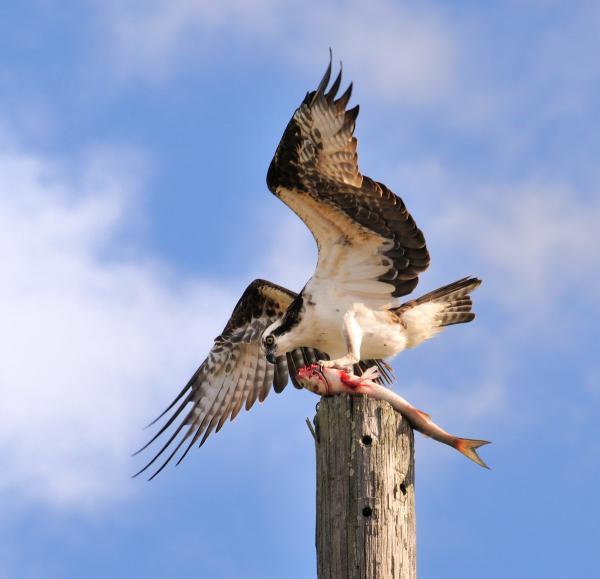 This is a photo of an Osprey dining on an unfortunate Mullet. The Osprey (a.k.a. Sea Hawk) is bird of prey that prefers fishing for its food. |