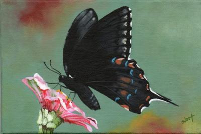 Black Swallowtail on a Pink Daisy. Acrylic, orriginal, minature on canvass with minature display easel included.