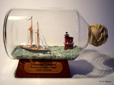 This is a miniature, to scale, reproduction of the schooner Virginia passing Wolf Trap Lighthouse on the Chesapeake Bay. Scene is placed inside an incredibly clear 1 liter bottle. Everything is handmade. To see more of my miniature fleet of ships in bottles, please visit: http://www.shipinbottles.com Enjoy!