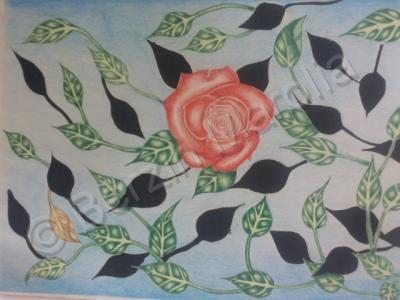 A rose n leaves done by water color pencils n some leaves are cut by a cutter n painted black