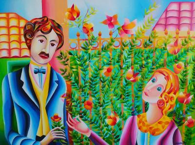 Technique: Acrylic on canvas Size: 55 cm x 75 cm Year: 2019 Comment: Beautiful painting that reflects love. A pure, naive love, full of poetry. With two characters in the foreground. A gentleman offering her a flower as a sign of his love. She is very romantic, delicate with a look full of innocence. My painting aims to capture that sublime and magical moment. In the background, the vegetation is laboriously painted with leaves, flowers and the architecture of a romantic city. The colors reflect the morning illumination, where in the sky you can see the degradations of pink, blues, violets very pastel. |