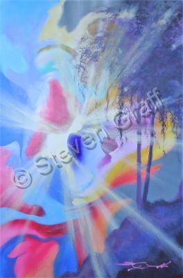 "Abundantly" is an original acrylic painting executed by hand on stretched cotton canvas in the size: 36 inches high by 24 inches wide. Light rays penetrate a randomly-colored field that includes a couple of trees in the foreground right in silhouette. The painting is signed on front, countersigned on back along with more artwork details, and the buyer also receives a signed Letter of Authenticity. Its official worldwide listing can be found on eBay.com |